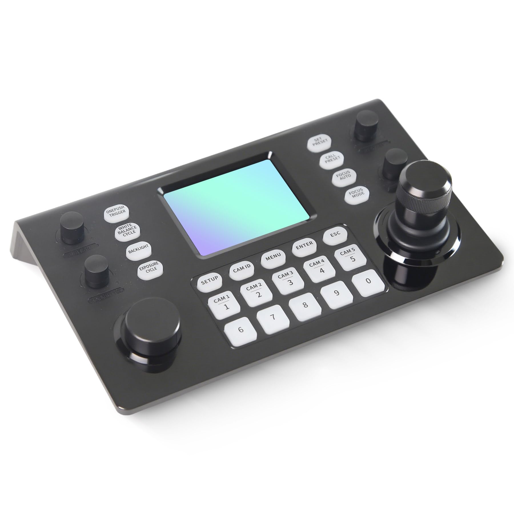 The controller features a 3.49" LCD display, a 3D joystick, various knobs, and a numeric keypad for intuitive control.
